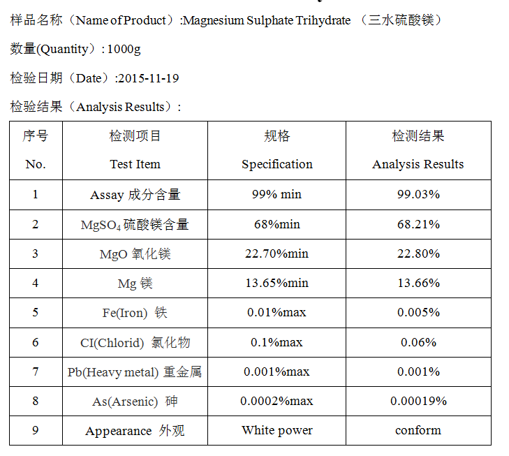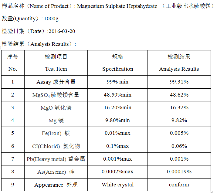 二、化學(xué)性質(zhì): 為白色或無色的針狀或斜柱狀結(jié)晶體,無臭﹑涼并微苦,分子量 : 246.47 ,比重 1.68 ,易溶于水,微溶于乙醇和甘油,在 67.5 ℃ 溶于自身的結(jié)晶水中。受熱分解, 70 ﹑ 80 ℃ 是失去四分子的結(jié)晶水。月 200 ℃ 失去所有的結(jié)晶水成無水物。在空氣(干燥)中易風(fēng)化為粉狀,加熱時逐漸脫去結(jié)晶水變?yōu)闊o水硫酸鎂,本產(chǎn)品不含任何有毒雜質(zhì)。七水硫酸鎂因為不容易溶解,比無水硫酸鎂更容易稱量,便于在工業(yè)中進行的定量控制。